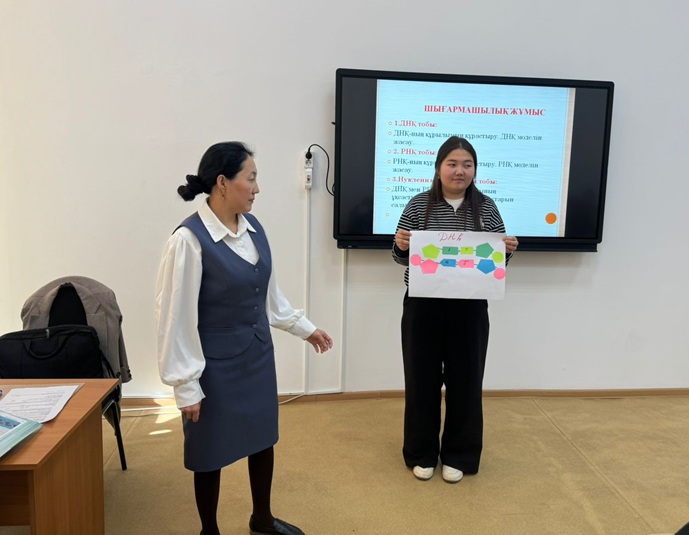 The aim of the lesson was to give students in-depth knowledge of the structural features and functions of DNA and RNA molecules, as well as to develop creative thinking and teamwork skills. During the lesson, students were able to apply their theoretical knowledge in practice, which helped to improve their skills in analyzing and solving biological problems.
