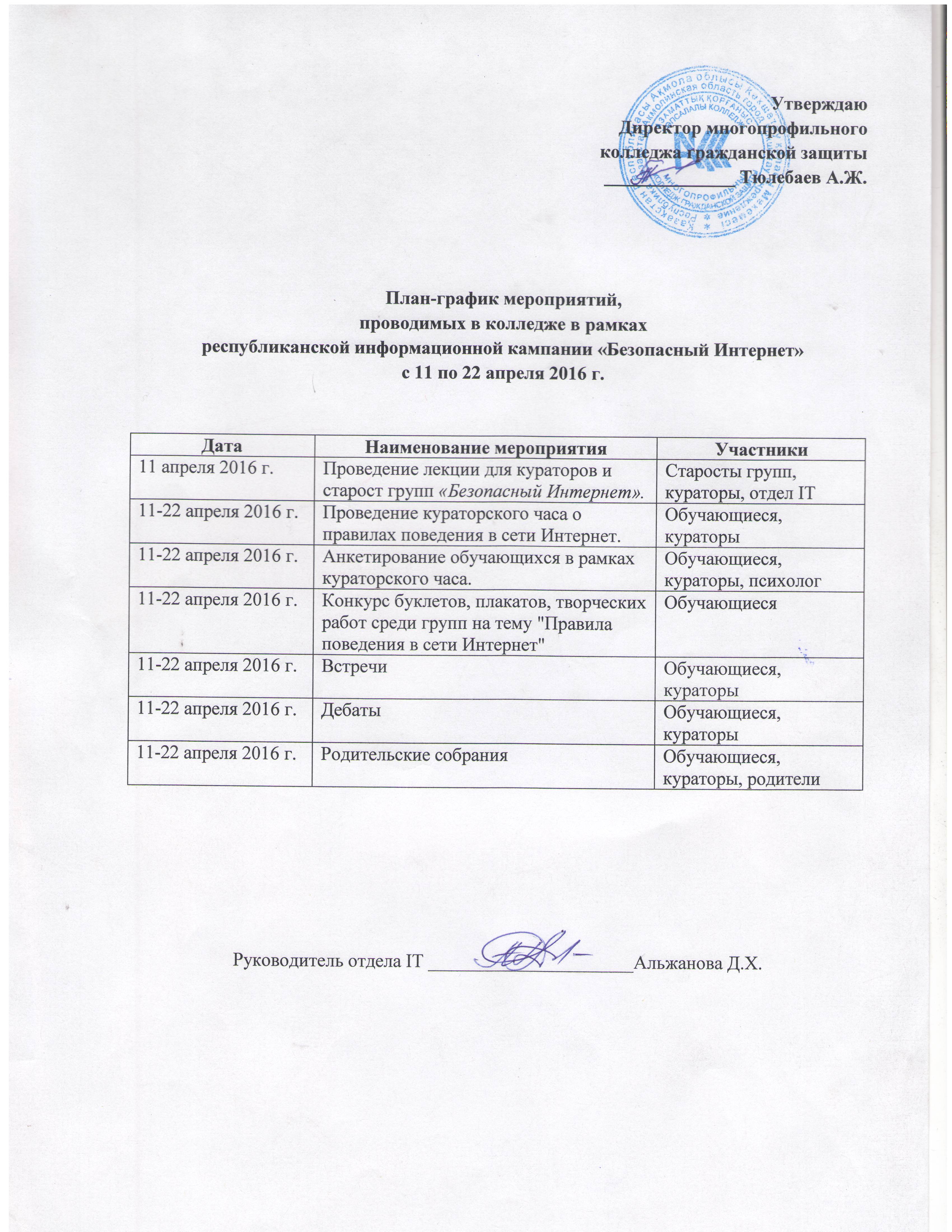 С 11 по 22 апреля 2016 года по инициативе Комитета по охране прав детей МОН РК проводится Информационная кампания «Безопасный интернет», основная цель которой – обеспечить доведение до несовершеннолетних, педагогов и родителей информации, направленной на повышение уровня осознания проблемы агрессивного Интернет-контента, повышение культуры пользования Интернет-ресурсами, ответственности взрослых пользователей Интернет-услуг в отношении контроля за Интернет-активностью несовершеннолетних.